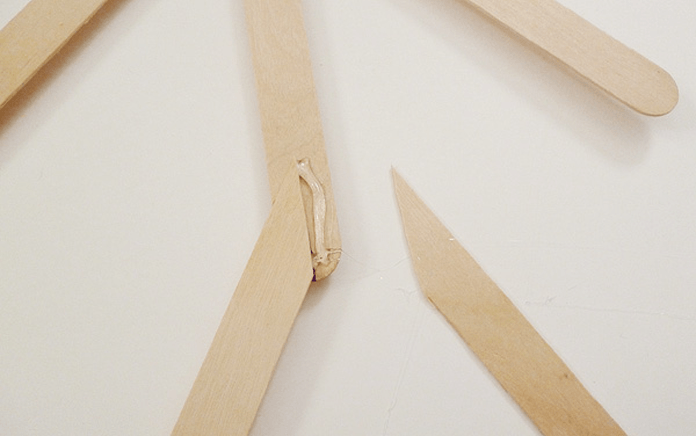 3. Для каждого конца палочки отберите по две палочки от мороженого. В этих палочках срежьте концы так, чтобы к концу одной палочки можно было приклеить две палочки. Ориентируйтесь на фото ниже.